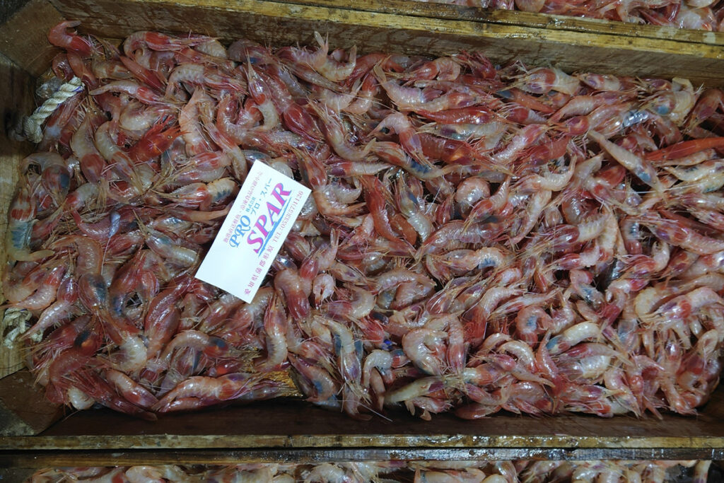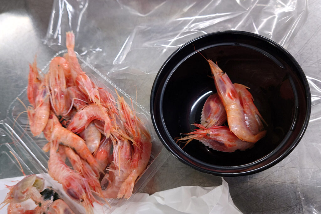 この日は朝3:40からの蒲郡形原漁港のセリでボタンエビ(標準和名:ミノ海老)や軟らかいアカイカをセリ落とし、ササッと試作し、皆さんの夕食に提供しました。