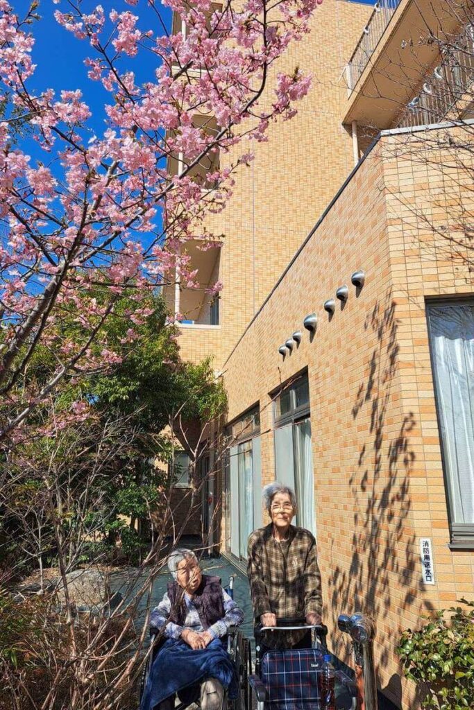 この日だけでも隙間時間を見計らって各階の介護スタッフが車いすや手を引いて同行などで多くの入居者さんを庭にお連れしていました。